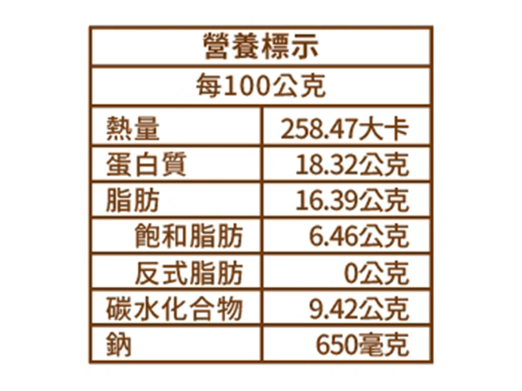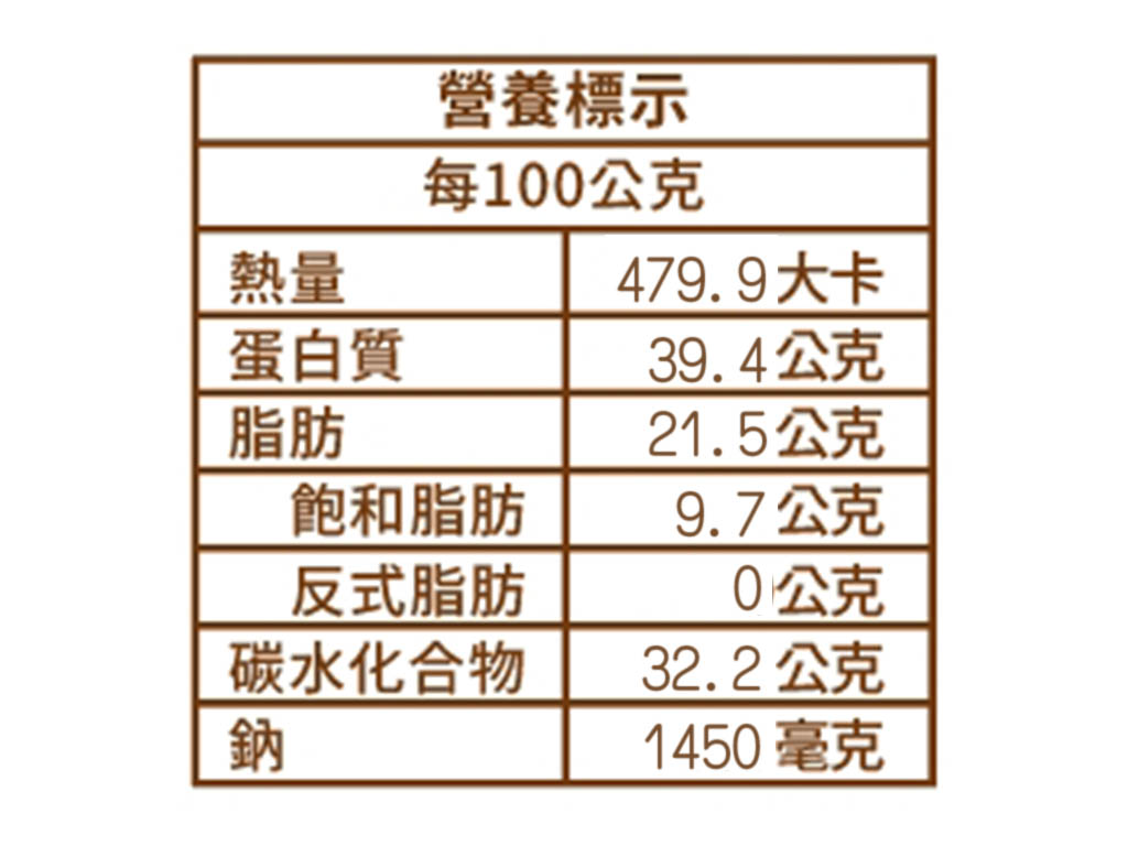 主要原料:豬肉(台灣)、豬腸衣(荷蘭)